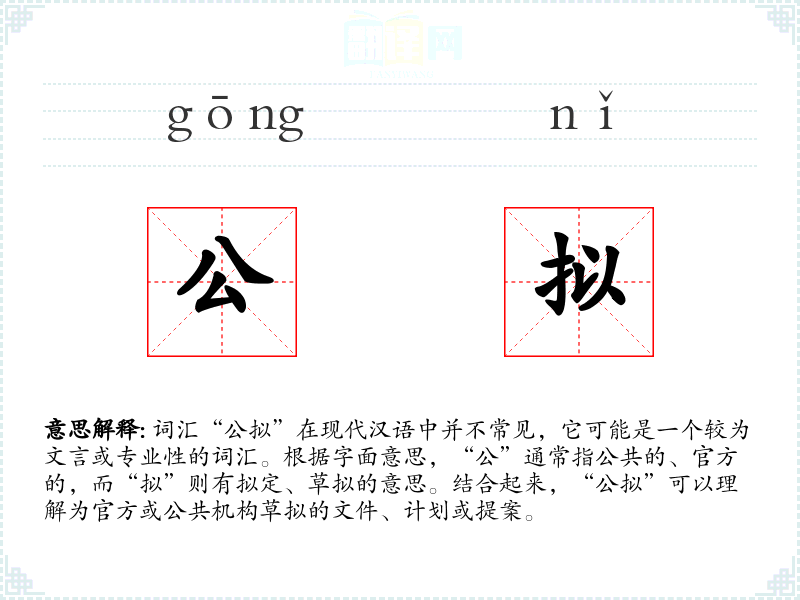 词汇“公拟”在现代汉语中并不常见,它可能是一个较为文言或专业性的词汇。根据字面意思,“公”通常指公共的、官方的,而“拟”则有拟定、草拟的意思。结合起来,“公拟”可以理解为官方或公共机构草拟的文件、计划或提案。
