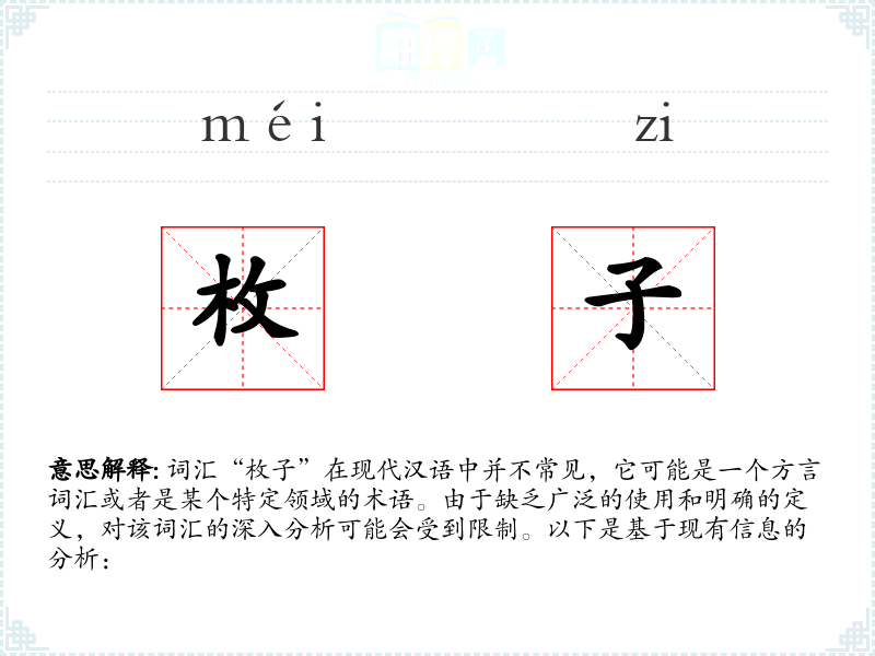 词汇“枚子”在现代汉语中并不常见,它可能是一个方言词汇或者是某个特定领域的术语。由于缺乏广泛的使用和明确的定义,对该词汇的深入分析可能会受到限制。以下是基于现有信息的分析: