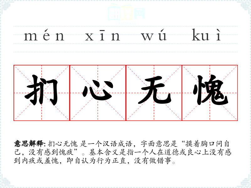 扪心无愧 是一个汉语成语,字面意思是“摸着胸口问自己,没有感到愧疚”。基本含义是指一个人在道德或良心上没有感到内疚或羞愧,即自认为行为正直,没有做错事。
