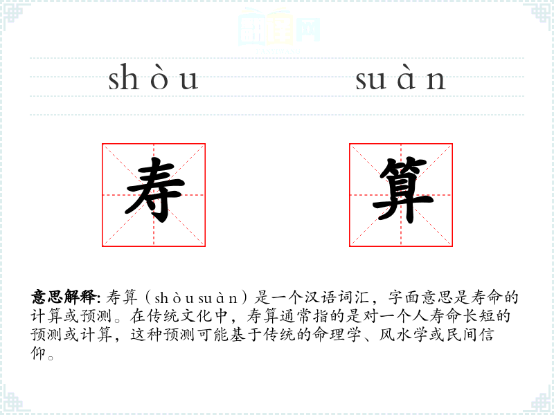 寿算(shòu suàn)是一个汉语词汇,字面意思是寿命的计算或预测。在传统文化中,寿算通常指的是对一个人寿命长短的预测或计算,这种预测可能基于传统的命理学、风水学或民间信仰。