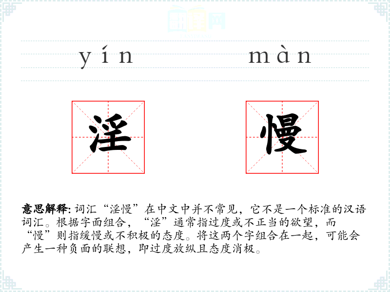 词汇“淫慢”在中文中并不常见,它不是一个标准的汉语词汇。根据字面组合,“淫”通常指过度或不正当的欲望,而“慢”则指缓慢或不积极的态度。将这两个字组合在一起,可能会产生一种负面的联想,即过度放纵且态度消极。