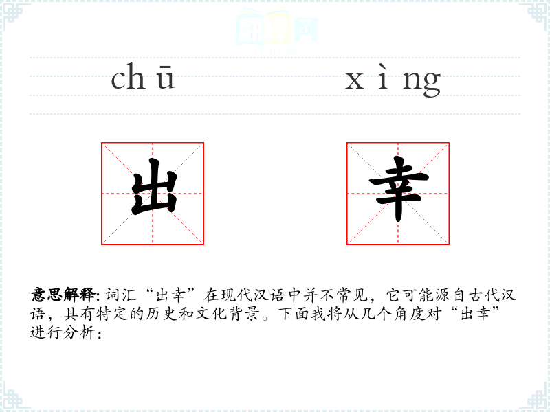 词汇“出幸”在现代汉语中并不常见,它可能源自古代汉语,具有特定的历史和文化背景。下面我将从几个角度对“出幸”进行分析: