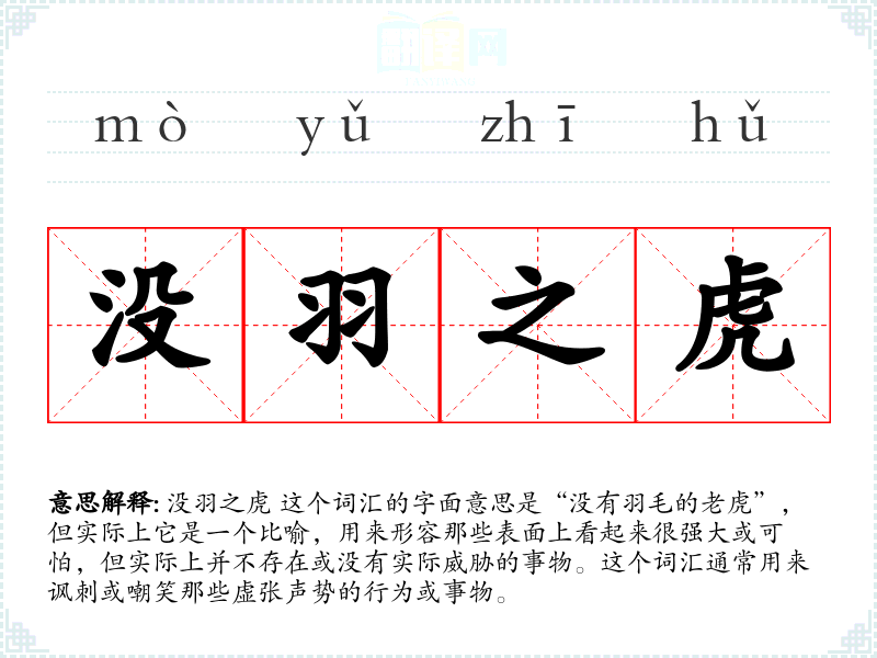 没羽之虎 这个词汇的字面意思是“没有羽毛的**”,但实际上它是一个比喻,用来形容那些表面上看起来很强大或可怕,但实际上并不存在或没有实际威胁的事物。这个词汇通常用来讽刺或嘲笑那些虚张声势的行为或事物。