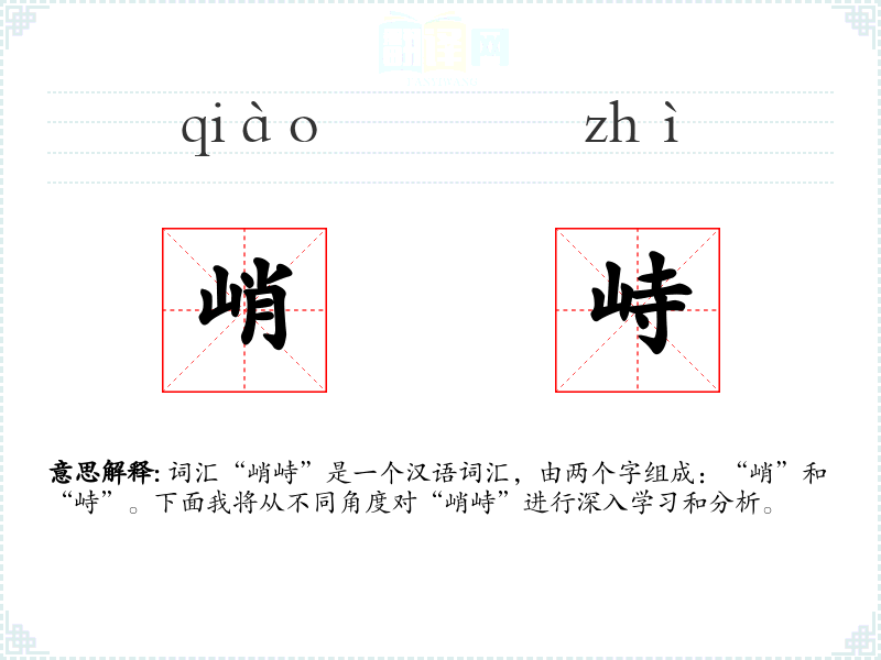 “峭”字古已有之,表示山势陡峭;“峙”字则表示耸立。两个字结合使用,形成了“峭峙”这一形容词,用以形容山峰或建筑物的陡峭和高耸。