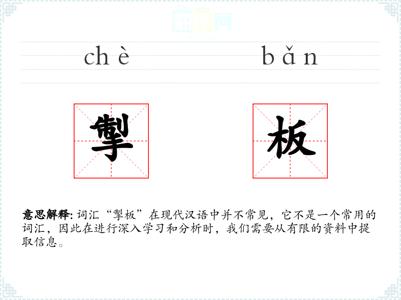 词汇“掣板”在现代汉语中并不常见,它不是一个常用的词汇,因此在进行深入学*和分析时,我们需要从有限的资料中提取信息。