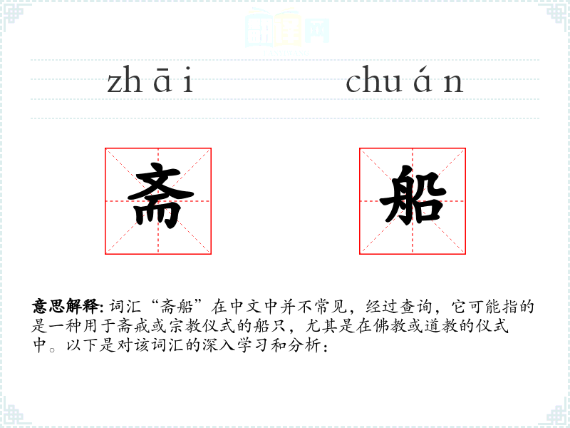词汇“斋船”在中文中并不常见,经过查询,它可能指的是一种用于斋戒或仪式的船只,尤其是在或道教的仪式中。以下是对该词汇的深入学*和分析: