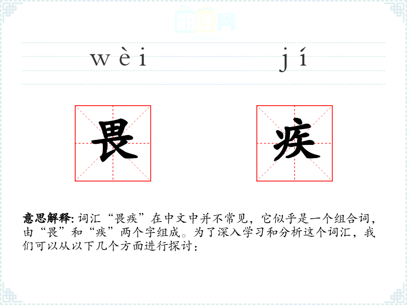 词汇“畏疾”在中文中并不常见,它似乎是一个组合词,由“畏”和“疾”两个字组成。为了深入学习和分析这个词汇,我们可以从以下几个方面进行探讨: