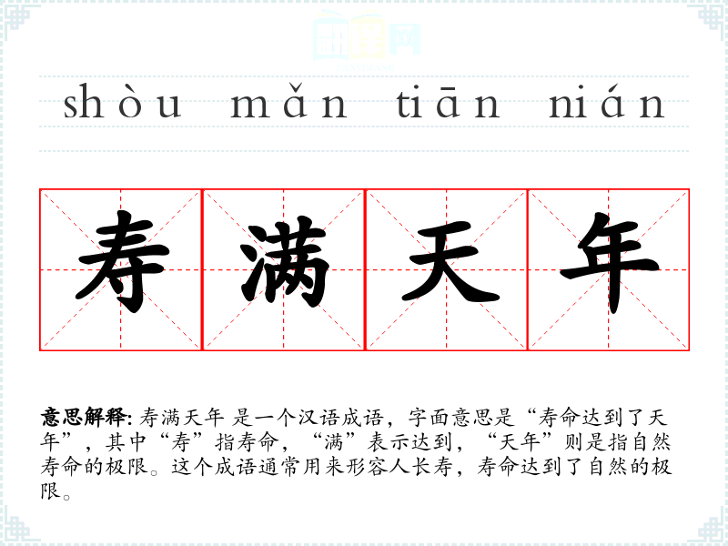 寿满天年 是一个汉语成语,字面意思是“寿命达到了天年”,其中“寿”指寿命,“满”表示达到,“天年”则是指自然寿命的极限。这个成语通常用来形容人长寿,寿命达到了自然的极限。
