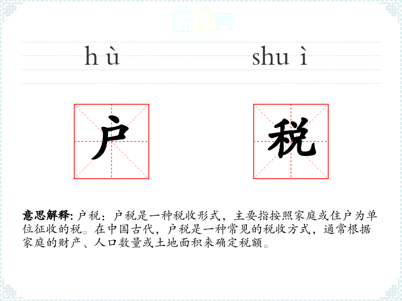 - 口语:在现代口语中,户税一词较少直接使用,但在讨论历史或税收政策时可能会提及。