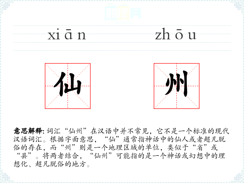 - 词源:“仙”源自古代对超自然存在的崇拜,“州”则是古代行政区划的名称。