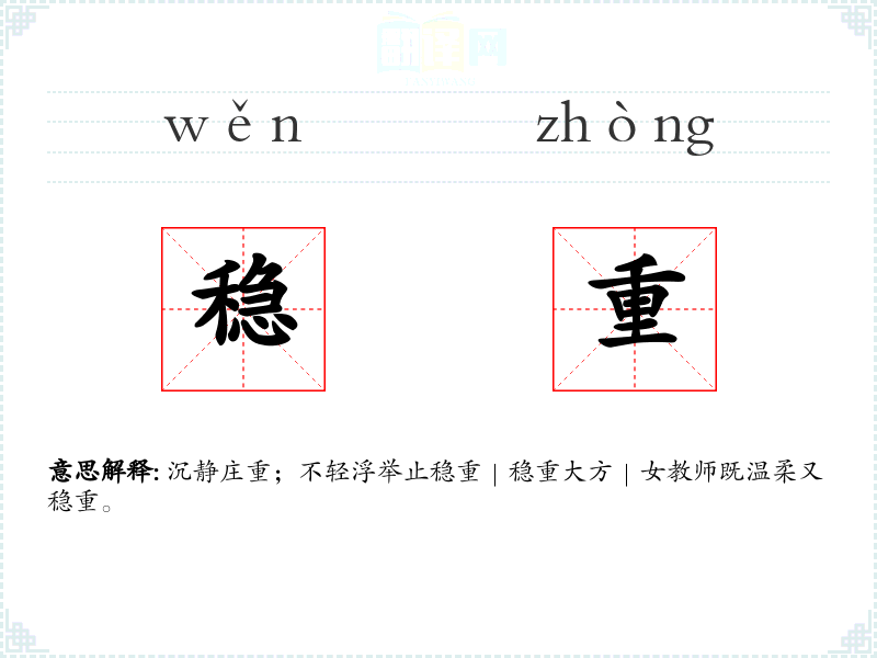 沉静庄重;不轻浮举止稳重|稳重大方|女教师既温柔又稳重。