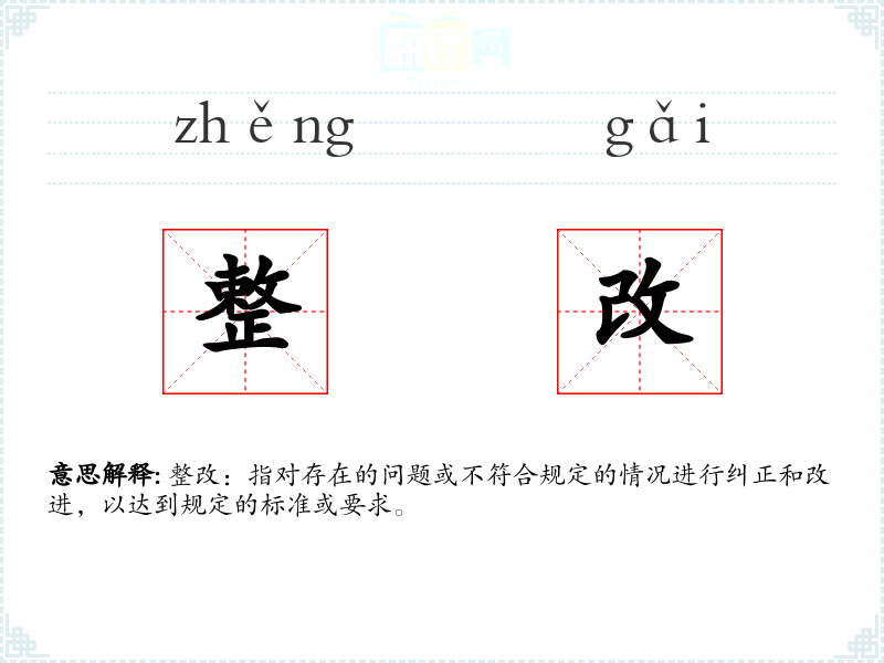 整改:指对存在的问题或不符合规定的情况进行纠正和改进,以达到规定的标准或要求。