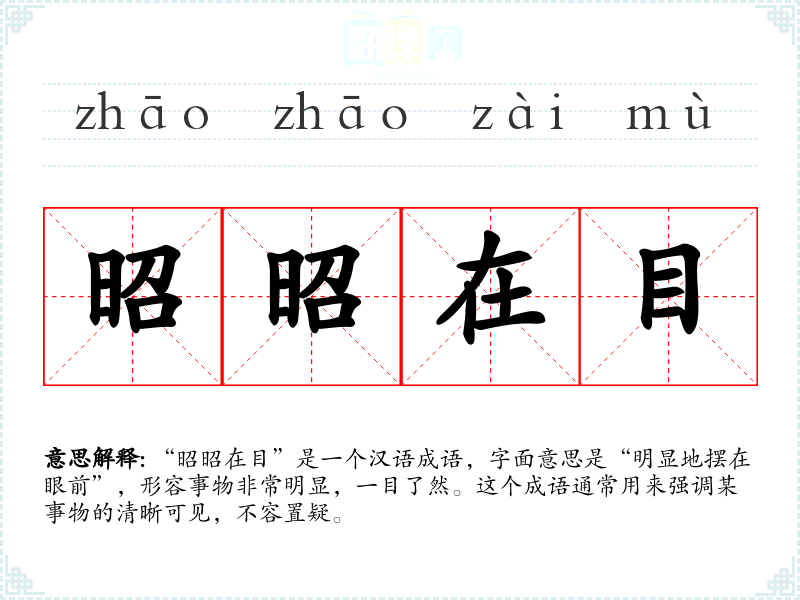 “昭昭在目”是一个汉语成语,字面意思是“明显地摆在眼前”,形容事物非常明显,一目了然。这个成语通常用来强调某事物的清晰可见,不容置疑。