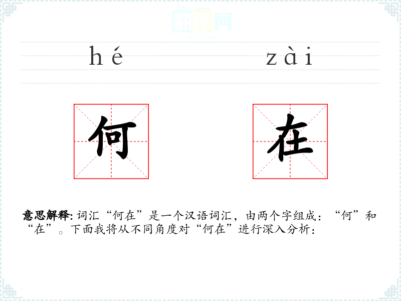 - 词源:“何”源自古代汉语,意为“什么”;“在”也源自古代汉语,意为“存在”。
