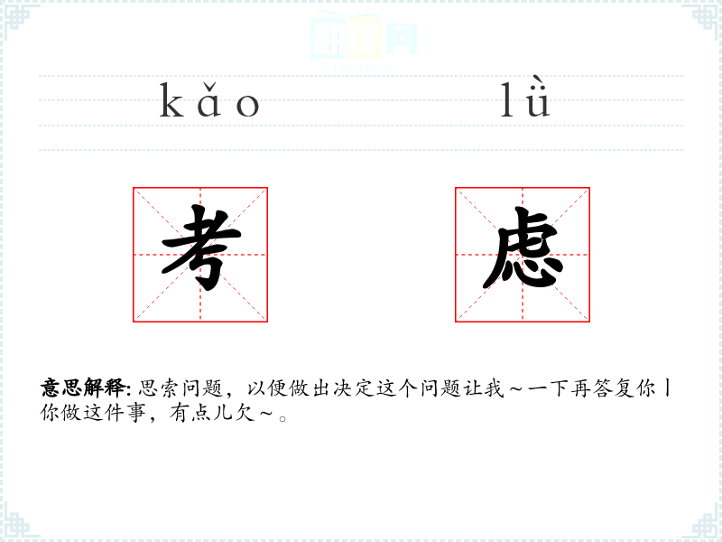 思索问题,以便做出决定这个问题让我~一下再答复你ㄧ你做这件事,有点儿欠~。