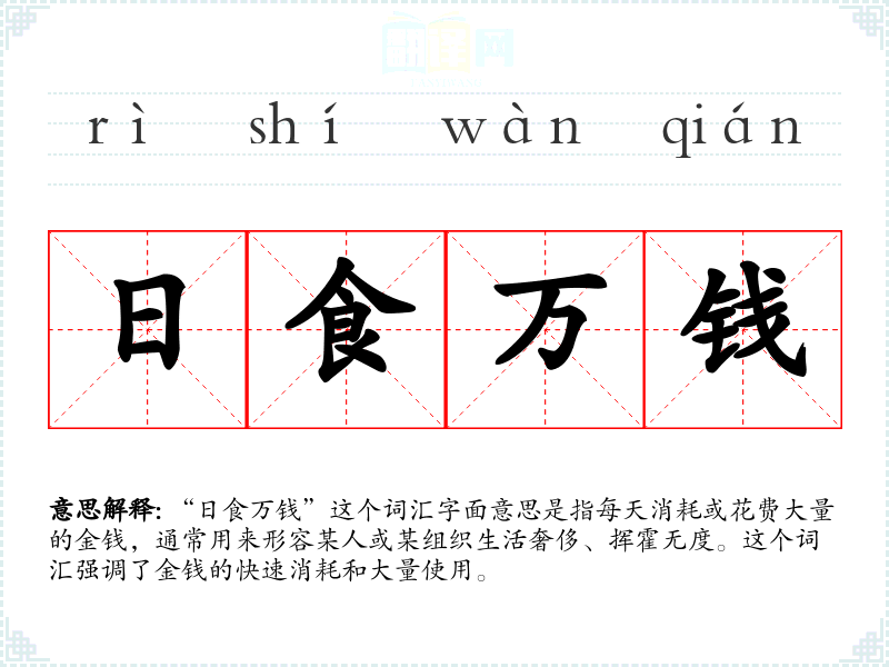 “日食万钱”这个词汇字面意思是指每天消耗或花费大量的金钱,通常用来形容某人或某组织生活奢侈、挥霍无度。这个词汇强调了金钱的快速消耗和大量使用。