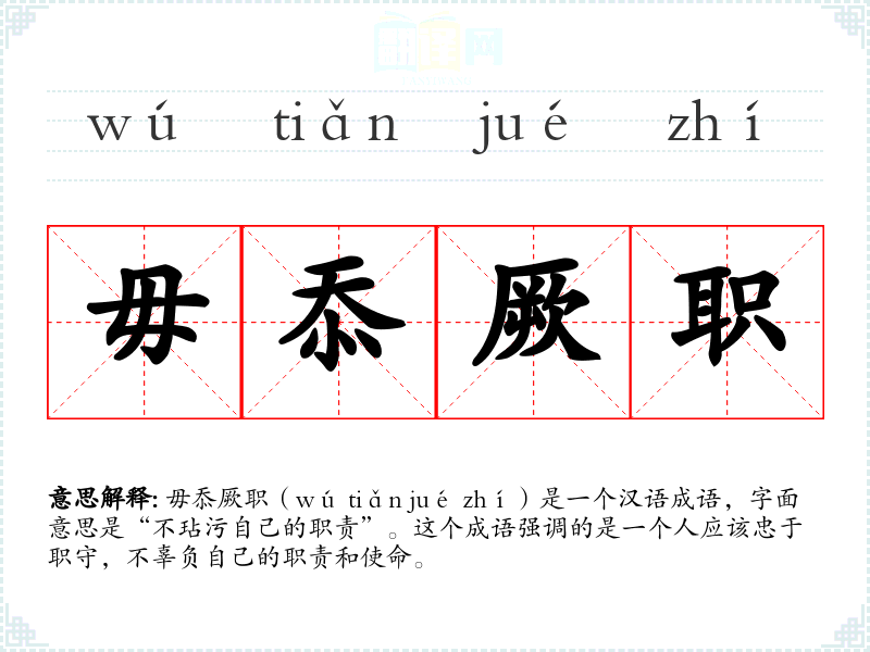 毋忝厥职(wú tiǎn jué zhí)是一个汉语成语,字面意思是“不玷污自己的职责”。这个成语强调的是一个人应该忠于职守,不辜负自己的职责和使命。