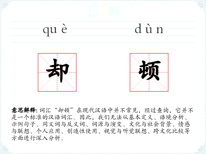 然而,如果我们从“却顿”这个词汇的构成来分析,可以推测它可能是由“却”和“顿”两个字组合而成的。在汉语中,“却”通常表示转折或拒绝的意思,而“顿”则可以表示停顿或一顿饭的意思。如果将这两个字组合起来,可能会产生一种“突然停顿”或“拒绝停顿”的意味,但这只是一种猜测,并没有实际的语言使用证据支持。