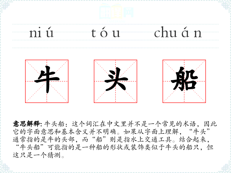 由于“牛头船”不是一个国际通用的词汇,它在不同语言或文化中的对应词汇和使用情况不详。如果有其他文化中类似的船只描述,可能会提供一些有趣的比较。