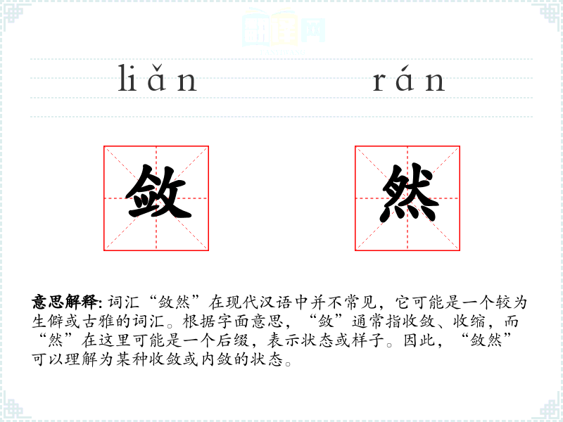 词汇“敛然”在现代汉语中并不常见,它可能是一个较为生僻或古雅的词汇。根据字面意思,“敛”通常指收敛、收缩,而“然”在这里可能是一个后缀,表示状态或样子。因此,“敛然”可以理解为某种收敛或内敛的状态。
