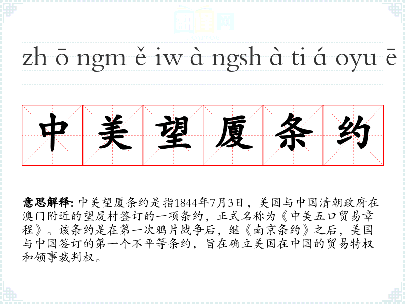 中美望厦条约的名称来源于签订地点“望厦村”,“条约”一词在中文中指两国或多国之间签订的正式协议。随着时间的推移,该词汇在历史学界和相关研究领域中被广泛使用,成为特定历史**的代名词。
