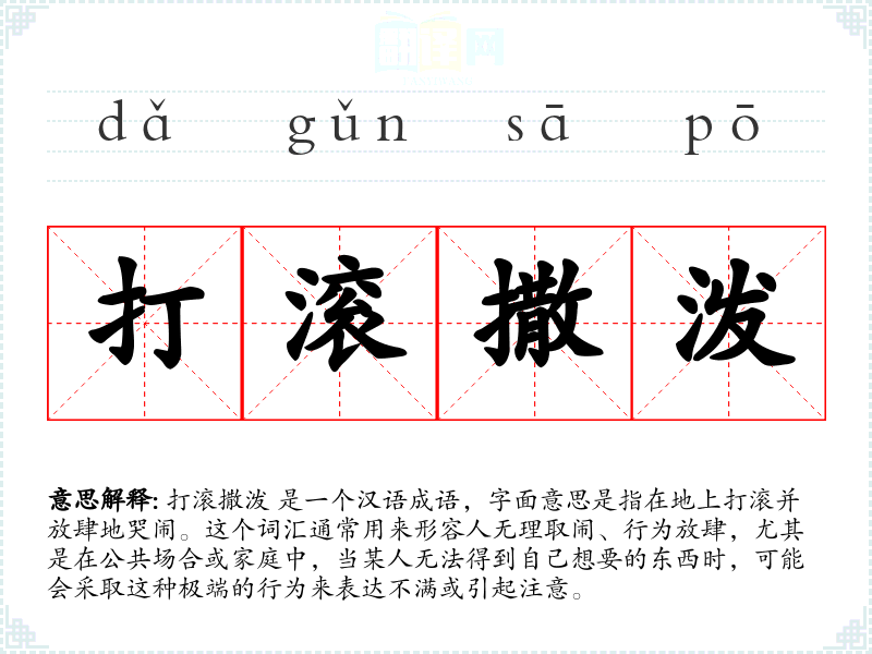 打滚撒泼 是一个汉语成语,字面意思是指在地上打滚并放肆地哭闹。这个词汇通常用来形容人无理取闹、行为放肆,尤其是在公共场合或家庭中,当某人无法得到自己想要的东西时,可能会采取这种极端的行为来表达不满或引起注意。