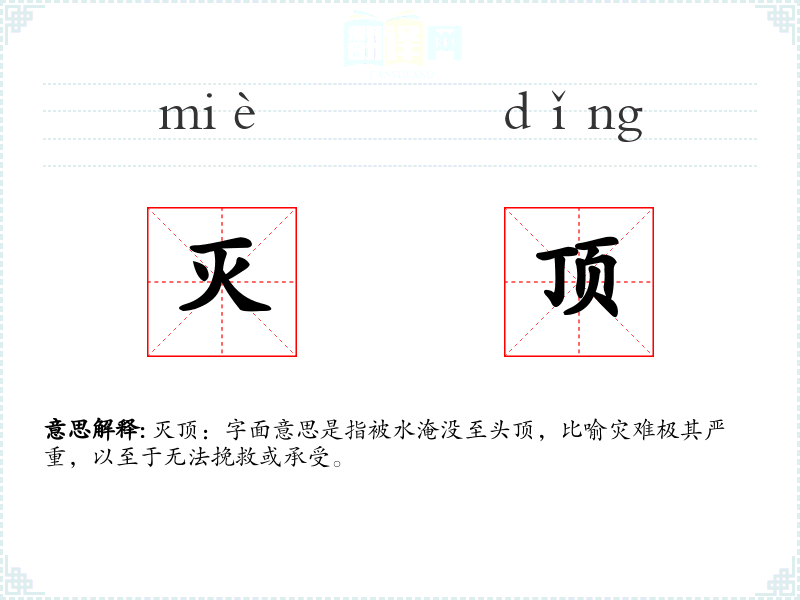 灭顶:字面意思是指被水淹没至头顶,比喻灾难极其严重,以至于无法挽救或承受。