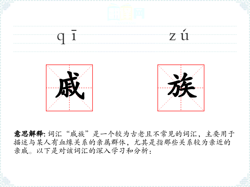 词汇“戚族”是一个较为古老且不常见的词汇,主要用于描述与某人有血缘关系的亲属群体,尤其是指那些关系较为亲近的亲戚。以下是对该词汇的深入学*和分析: