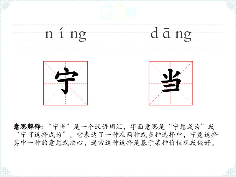“宁当”这个词源于古代汉语,其使用可以追溯到《诗经》等古代文献。随着时间的推移,它的使用逐渐固定下来,成为表达选择意愿的常用词汇。