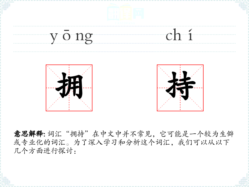 词汇“拥持”在中文中并不常见,它可能是一个较为生僻或专业化的词汇。为了深入学习和分析这个词汇,我们可以从以下几个方面进行探讨: