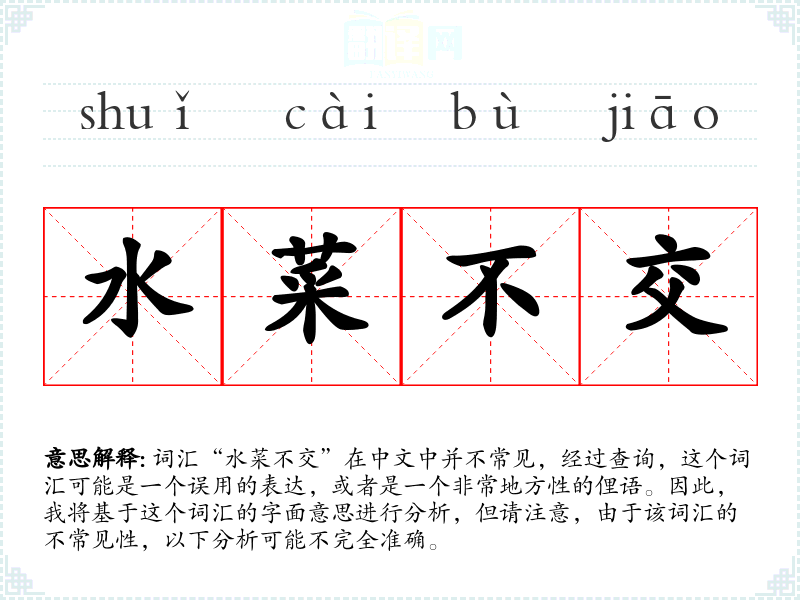 词汇“水菜不交”在中文中并不常见,经过查询,这个词汇可能是一个误用的表达,或者是一个非常地方性的俚语。因此,我将基于这个词汇的字面意思进行分析,但请注意,由于该词汇的不常见性,以下分析可能不完全准确。