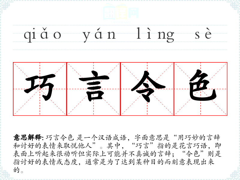 巧言令色 是一个汉语成语,字面意思是“用巧妙的言辞和讨好的表情来取悦他人”。其中,“巧言”指的是花言巧语,即表面上听起来很动听但实际上可能并不真诚的言辞;“令色”则是指讨好的表情或态度,通常是为了达到某种目的而刻意表现出来的。