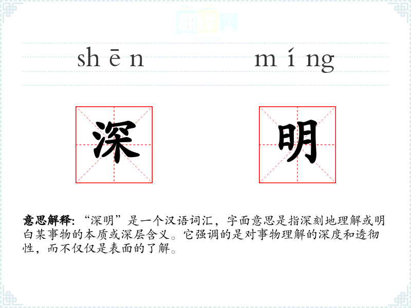 在英语中,“深明”可以对应为“profound understanding”或“deep insight”,这些表达也强调了对事物理解的深度和透彻性。