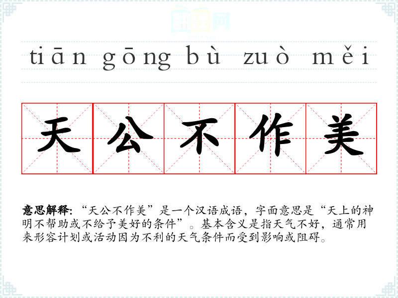 例如,计划已久的户外烧烤因为突如其来的大雨而取消,这时就可以用“天公不作美”来形容这种情况。