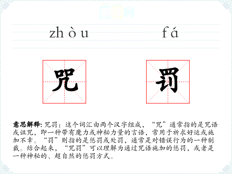 咒罚:这个词汇由两个汉字组成,“咒”通常指的是咒语或诅咒,即一种带有魔力或神秘力量的言语,常用于祈求好运或施加不幸。“罚”则指的是惩罚或处罚,通常是对错误行为的一种制裁。结合起来,“咒罚”可以理解为通过咒语施加的惩罚,或者是一种神秘的、超自然的惩罚方式。