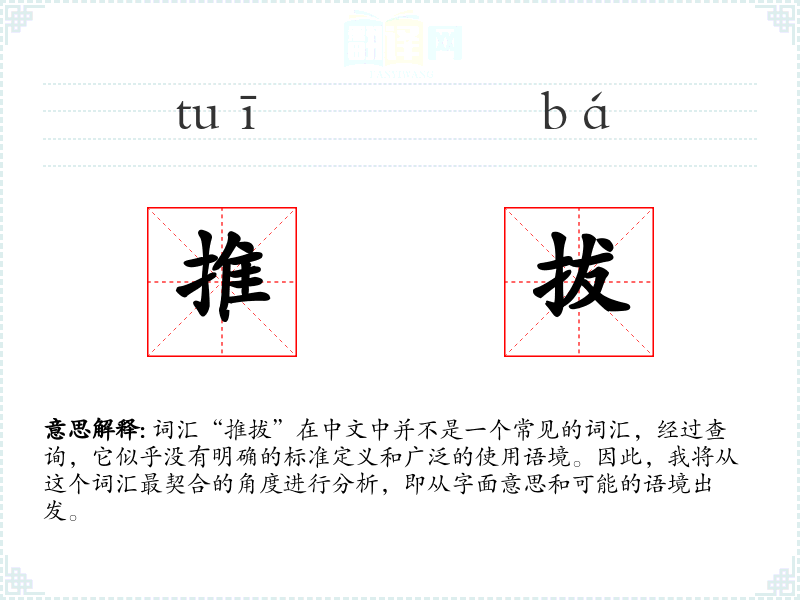 “推拔”字面意思可能是指推动和拔出两个动作的结合。然而,在现代汉语中,这个词汇并不常见,可能是一个较为生僻或专业领域的词汇。