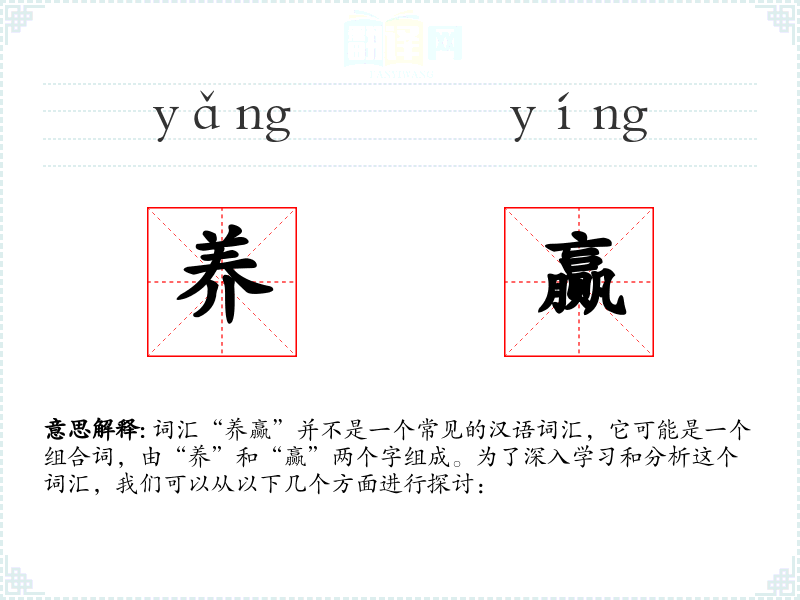 词汇“养赢”并不是一个常见的汉语词汇,它可能是一个组合词,由“养”和“赢”两个字组成。为了深入学习和分析这个词汇,我们可以从以下几个方面进行探讨: