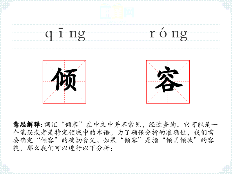 词汇“倾容”在中文中并不常见,经过查询,它可能是一个笔误或者是特定领域中的术语。为了确保分析的准确性,我们需要确定“倾容”的确切含义。如果“倾容”是指“倾国倾城”的容貌,那么我们可以进行以下分析: