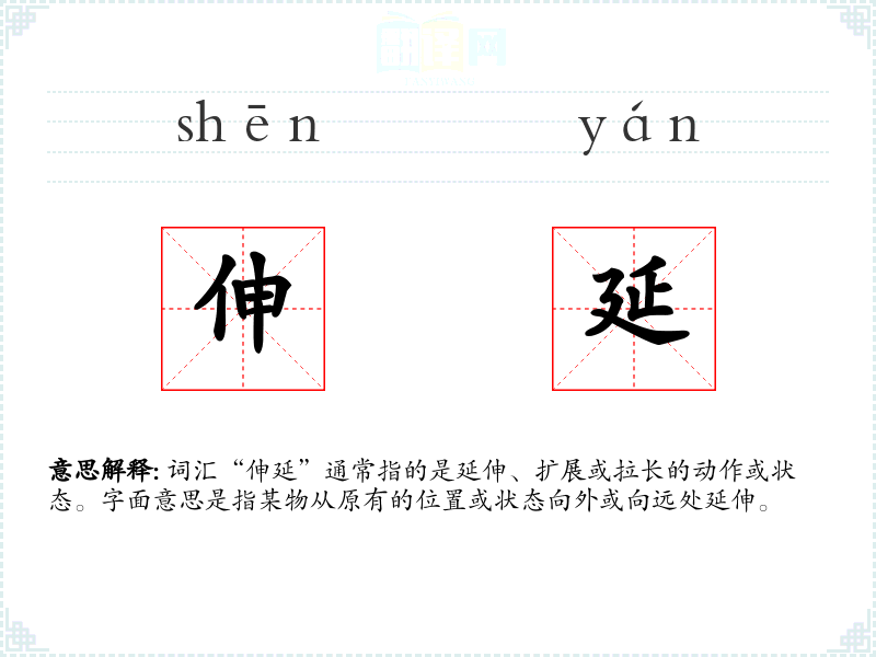 词汇“伸延”通常指的是延伸、扩展或拉长的动作或状态。字面意思是指某物从原有的位置或状态向外或向远处延伸。