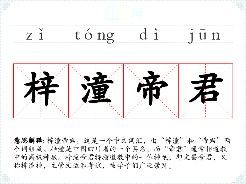 梓潼帝君:这是一个中文词汇,由“梓潼”和“帝君”两个词组成。梓潼是**四川省的一个县名,而“帝君”通常指道教中的高级神祇。梓潼帝君特指道教中的一位神祇,即文昌帝君,又称梓潼神,主管文运和考试,被学子们广泛崇拜。