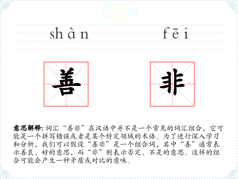 - 字面意思:结合“善”和“非”的字面意思,“善非”可能表示“不是善的”或“非善”,即不善良或不好的。