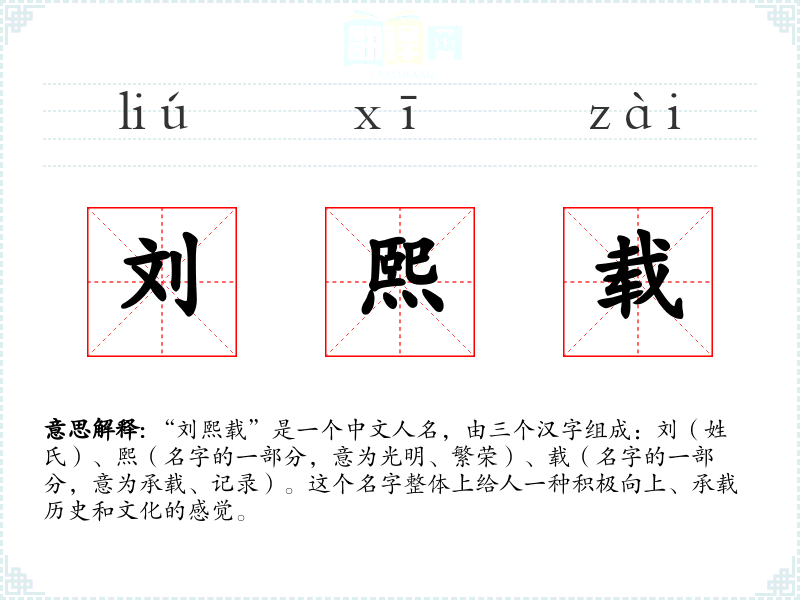 “刘”是一个古老的姓氏,源自古代的部落名称。“熙”和“载”在古代汉语中都有积极的含义,随着时间的推移,这些字的意义没有发生显著的变化。