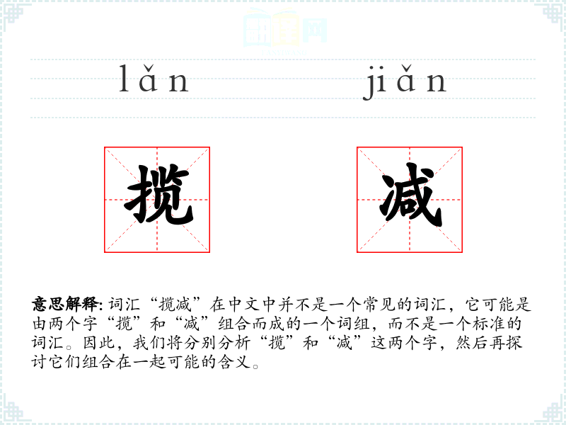 词汇“揽减”在中文中并不是一个常见的词汇,它可能是由两个字“揽”和“减”组合而成的一个词组,而不是一个标准的词汇。因此,我们将分别分析“揽”和“减”这两个字,然后再探讨它们组合在一起可能的含义。