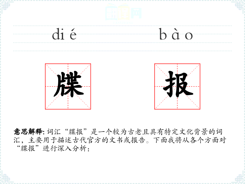 “牒”字源于古代的文书形式,而“报”字则表示报告或传达。随着时间的推移,“牒报”一词逐渐固定为指代官方文书的专用词汇。