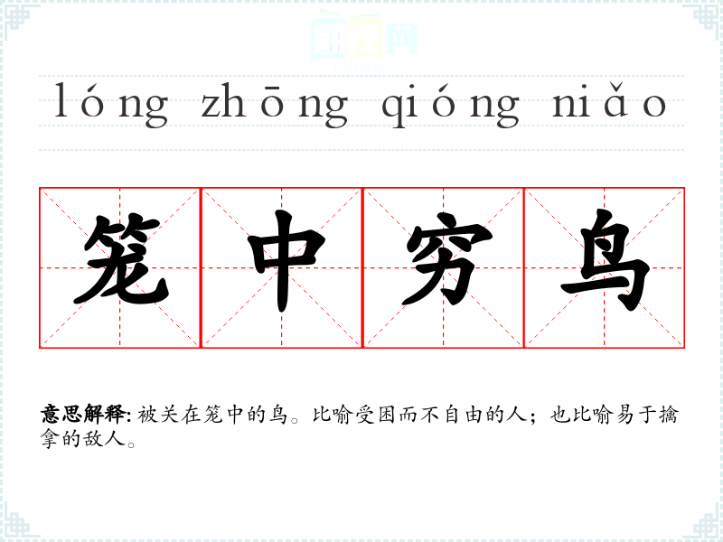 被关在笼中的鸟。比喻受困而不自由的人;也比喻易于擒拿的敌人。