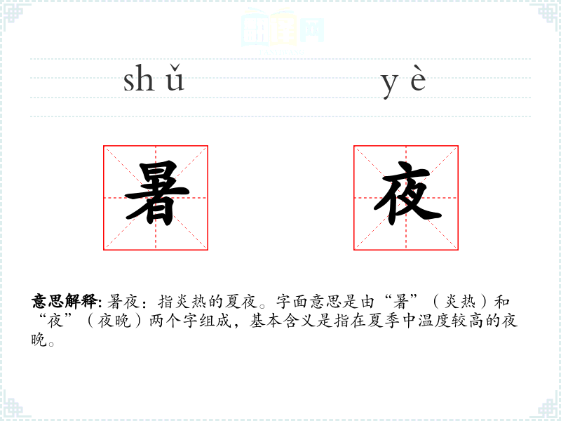暑夜:指炎热的夏夜。字面意思是由“暑”(炎热)和“夜”(夜晚)两个字组成,基本含义是指在夏季中温度较高的夜晚。