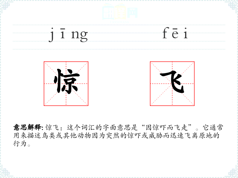 惊飞:这个词汇的字面意思是“因惊吓而飞走”。它通常用来描述鸟类或其他动物因为突然的惊吓或威胁而迅速飞离原地的行为。