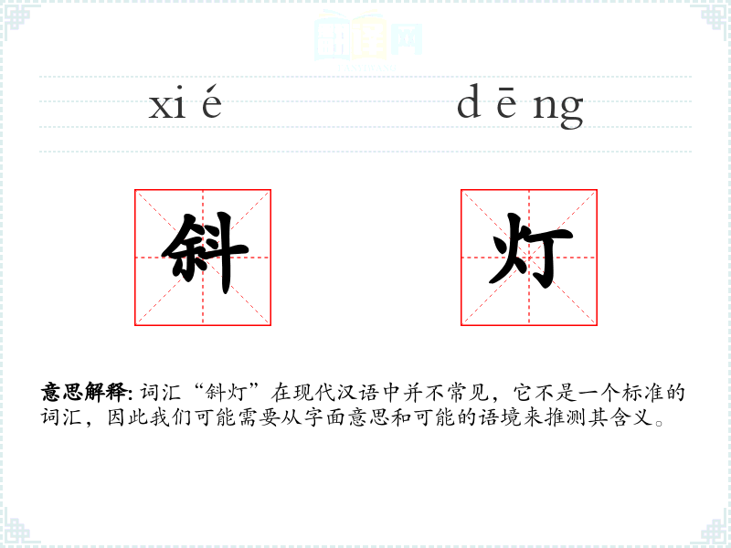 词汇“斜灯”在现代汉语中并不常见,它不是一个标准的词汇,因此我们可能需要从字面意思和可能的语境来推测其含义。