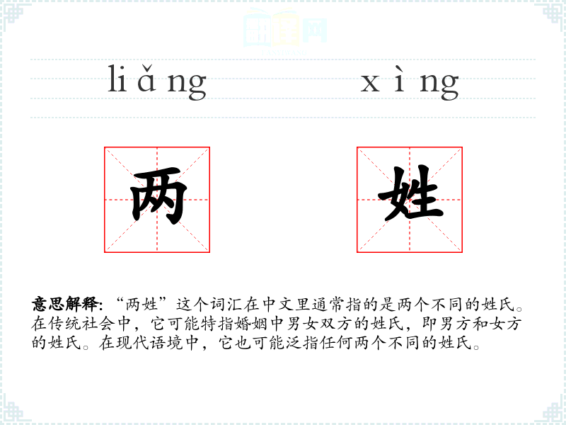 “两姓”这个词汇在中文里通常指的是两个不同的姓氏。在传统社会中,它可能特指婚姻中男女双方的姓氏,即男方和女方的姓氏。在现代语境中,它也可能泛指任何两个不同的姓氏。