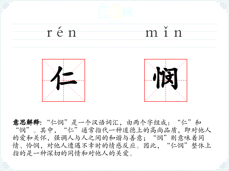 “仁悯”是一个汉语词汇,由两个字组成:“仁”和“悯”。其中,“仁”通常指代一种道德上的高尚品质,即对他人的爱和关怀,强调人与人之间的和谐与善意;“悯”则意味着同情、怜悯,对他人遭遇不幸时的情感反应。因此,“仁悯”整体上指的是一种深切的同情和对他人的关爱。